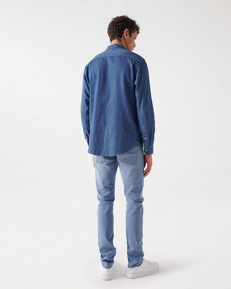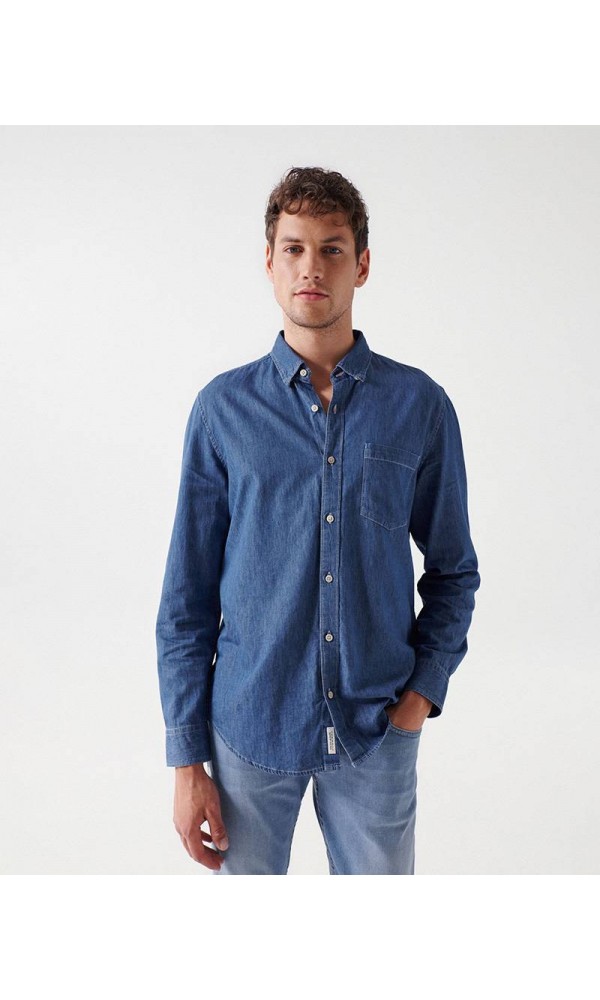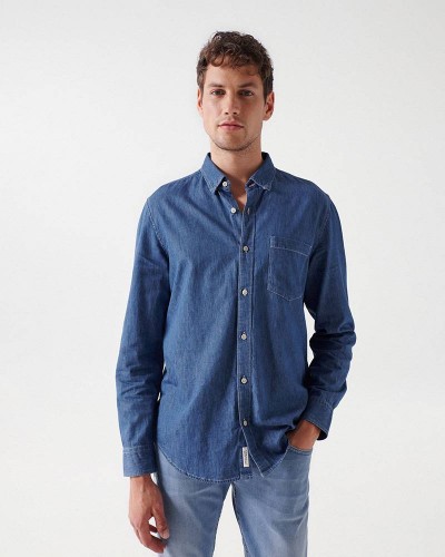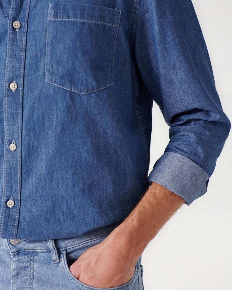 Chemise coupe droite. Denim. Couleur bleue. Manches longues. Col. Ouverture frontale avec des boutons. Poche frontale.
