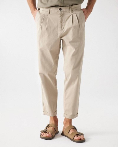 Pantalon chino. Beige. Coupe straight. Jambe cropped straight. Taille basse. Fermeture éclair et bouton. Quatre poches. Avec passants. Plis.