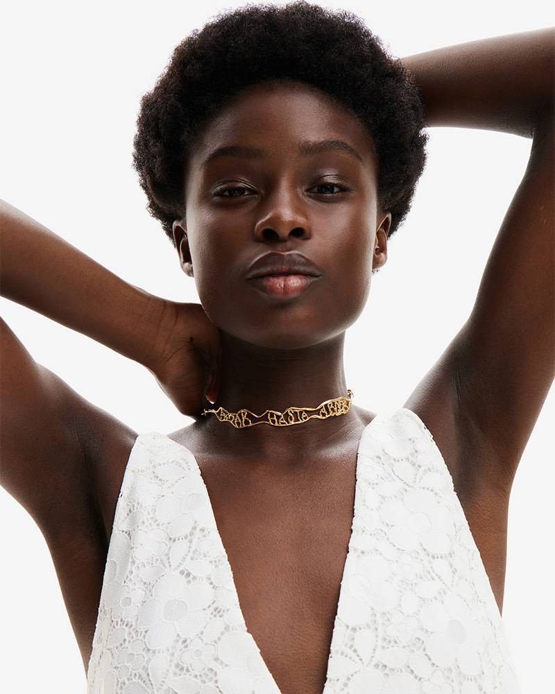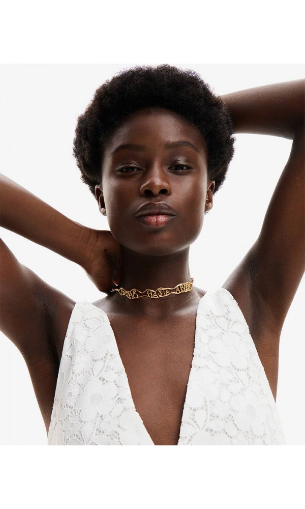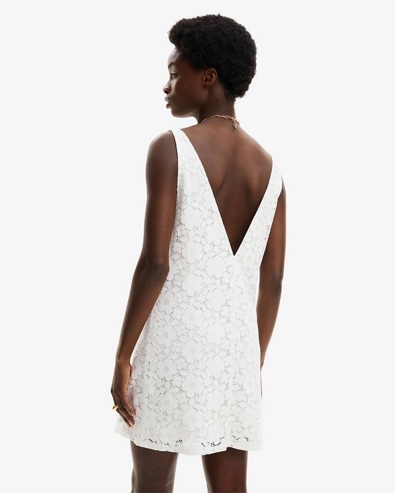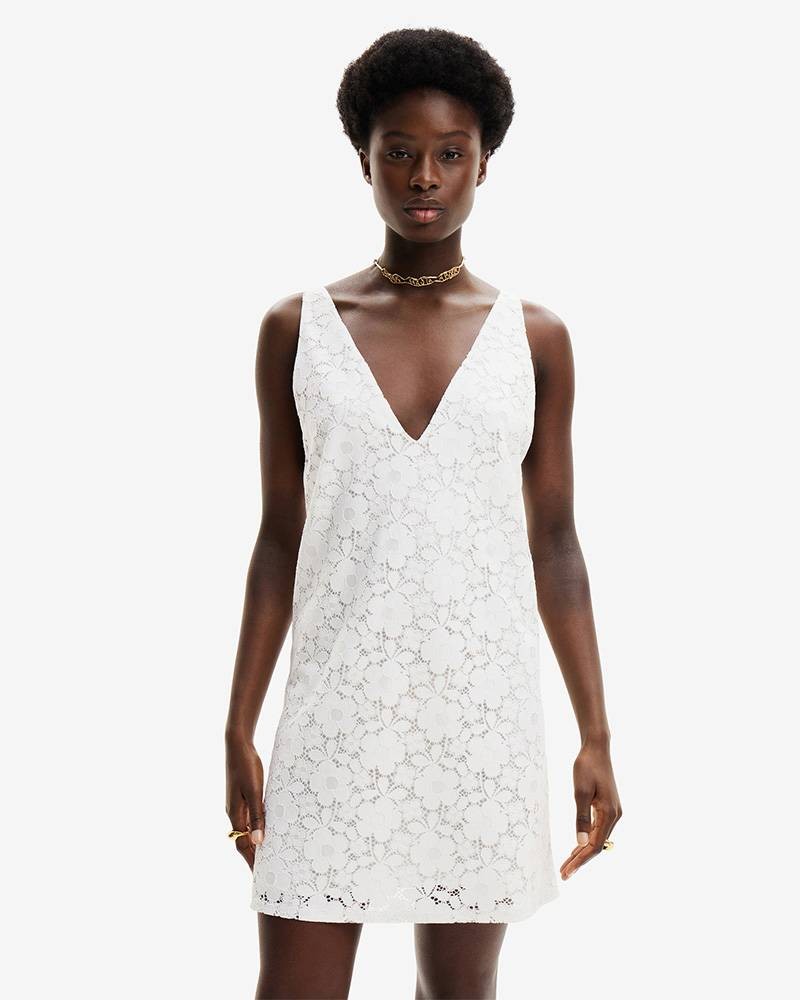 Robe courte droite à bretelles et décolleté en V en dentelle fleurie.