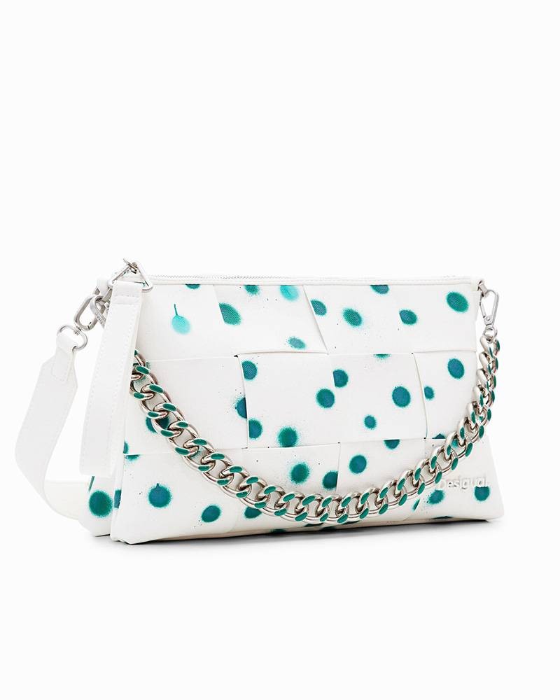 Sac à bandoulière de taille moyenne tressé en tissu effet cuir texturé à imprimé gouttes, doté de plusieurs anses et compartiments.